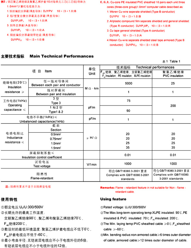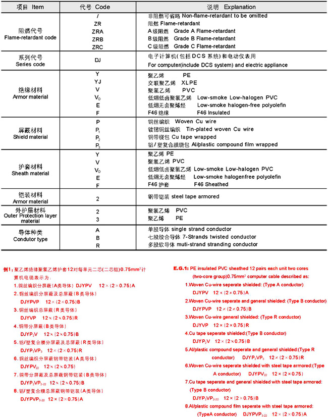 | 1 | DJYPV | 铜芯聚乙烯绝缘聚氯乙烯护套铜丝编织分屏蔽电子计算机电缆 |